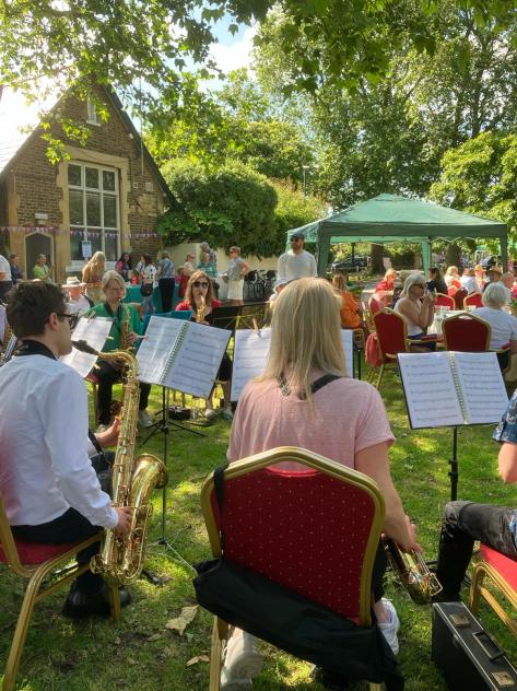 Members of the Band and friends offer jolly music groups to support Barnes charity FiSH as part of the Open Gardens initiative.